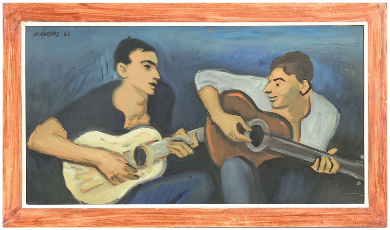 RUGGERO ALFREDO MICHAHELLES (1898-1976) Musicanti 1963 olio su faesite, firmato e datato, in cornice cm 29x55,5 MUSICIANS, OIL ON FAESITE