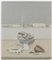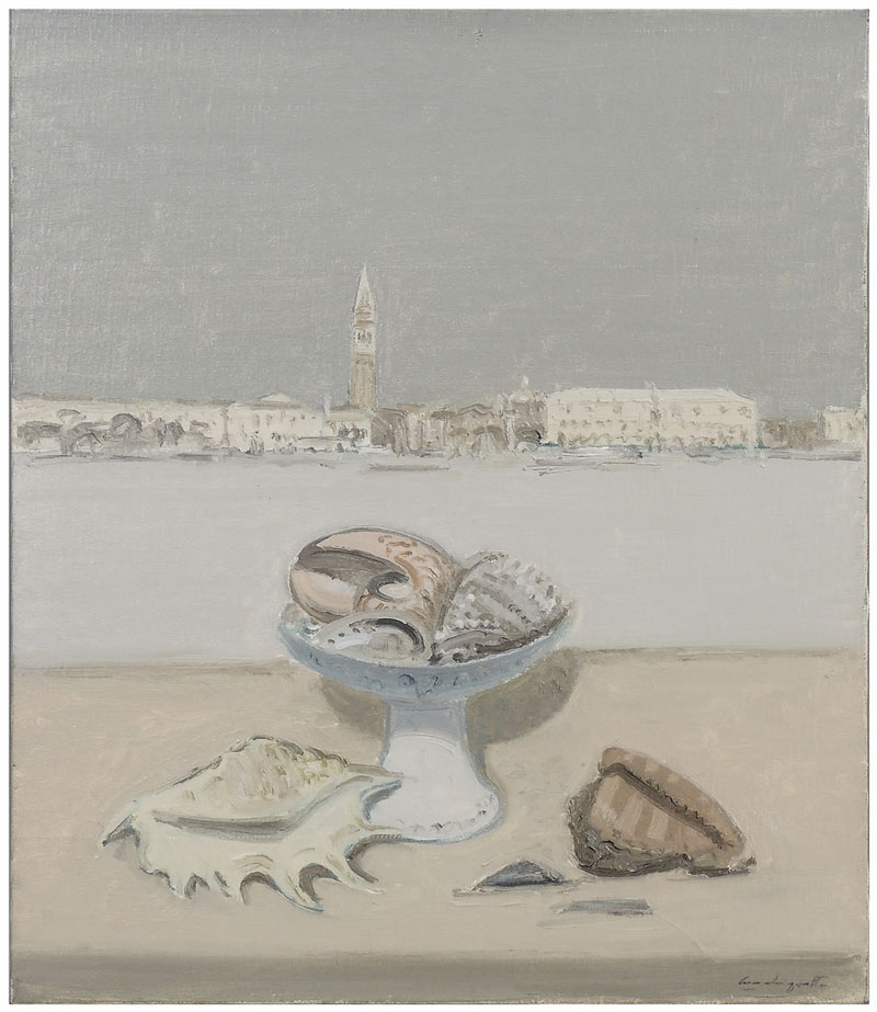 RENZO CODOGNOTTO Natura morta con conchiglie con veduta di Venezia sullo...