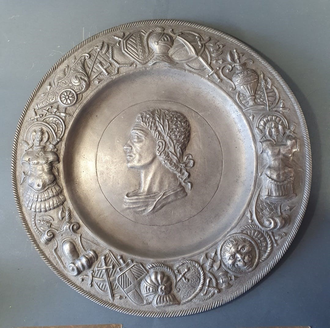 Vassoio da parata con profilo di imperatore romano e panoplie XIX-XX secolo