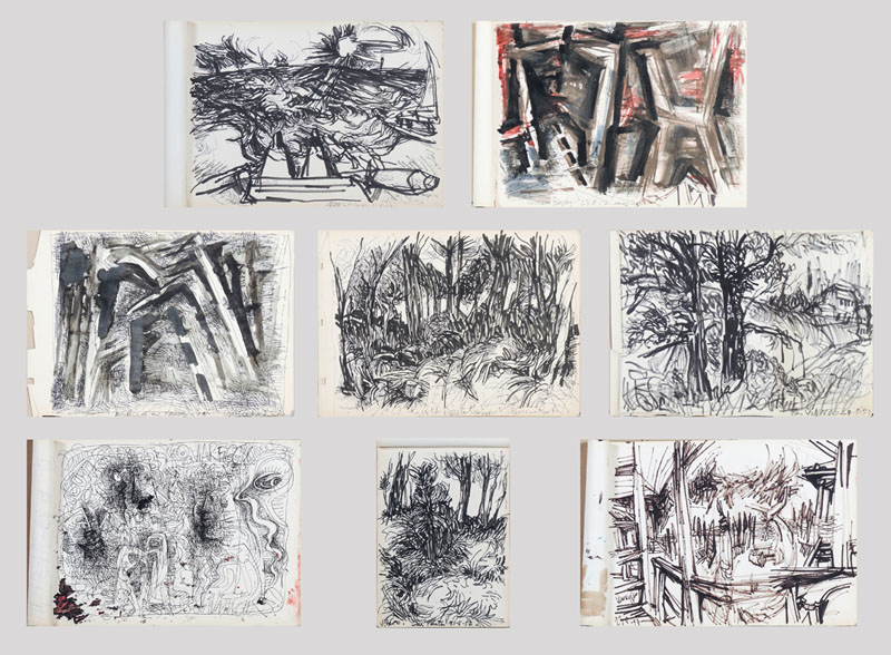 VINICIO BERTI (1921-1991) Disegni di Vinicio Berti fatti a Viareggio dal 20 al 26 agosto 1957 album contenente otto bozzetti a tecnica mista su carta, firmati e datati, alcuni difetti album cm 34x49 VINICIO BERTI'S DRAWINGS, EIGHT MIXED MEDIA SKETCHES ON PAPER