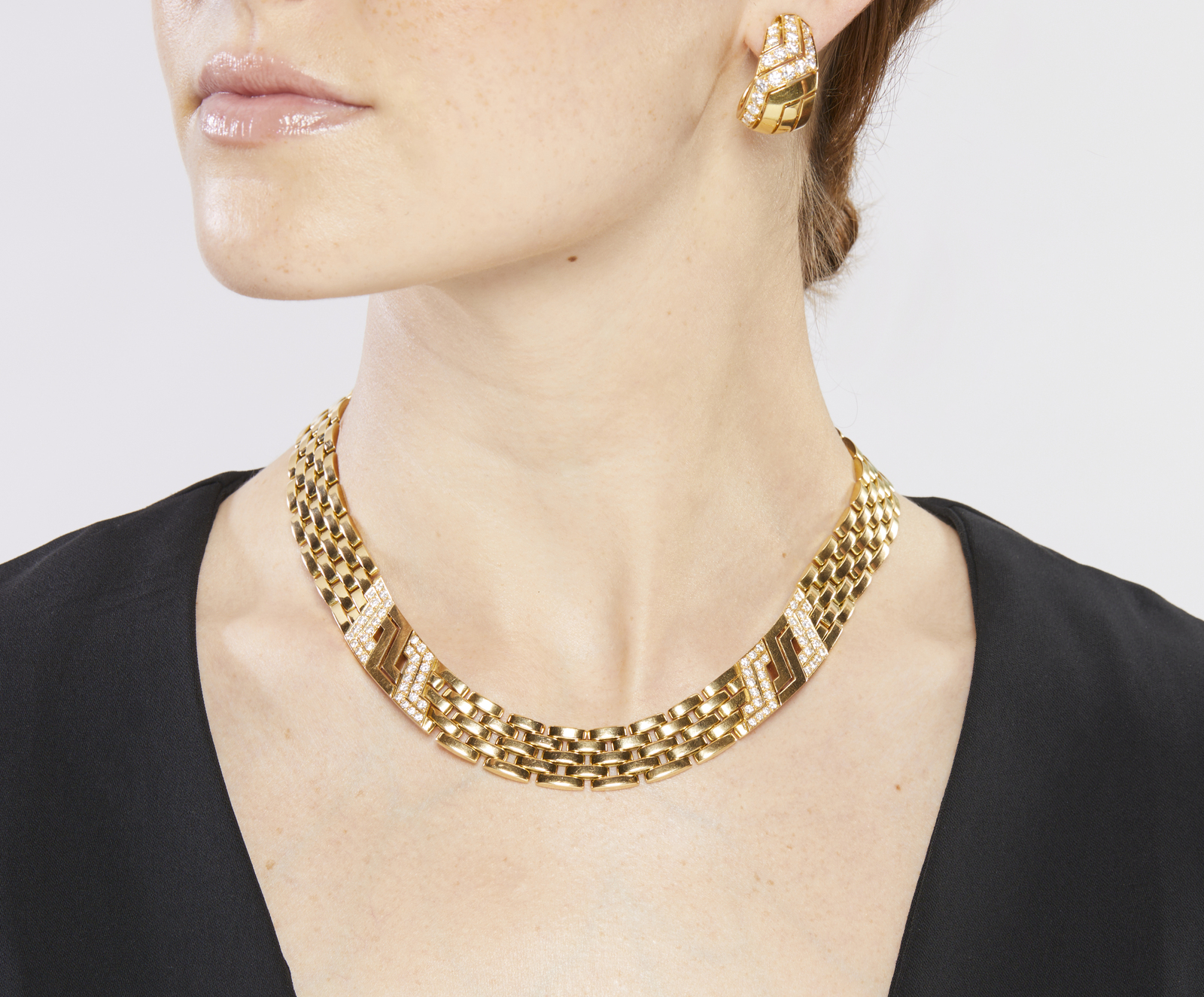 CARTIER - Parure composta da collier e orecchini Panthere in oro giallo 18k e diamanti bianchi taglio a brillante ct 5,50 circa.