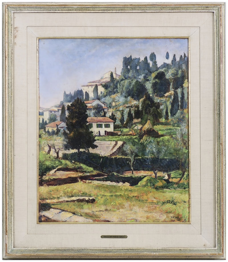 BACCIO MARIA BACCI (1888-1974) Veduta di Fiesole 1961 olio su cartone, firmato e datato, in cornice cm 55x45 Al verso reca iscrizioni FIESOLE VIEW, OIL ON CARDBOARD