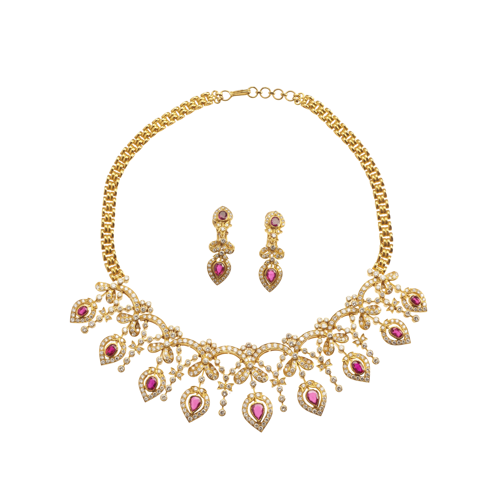 - Parure con collana in oro giallo 18k e parte centrale 9k con diamanti e rubini ovali e gocce .
