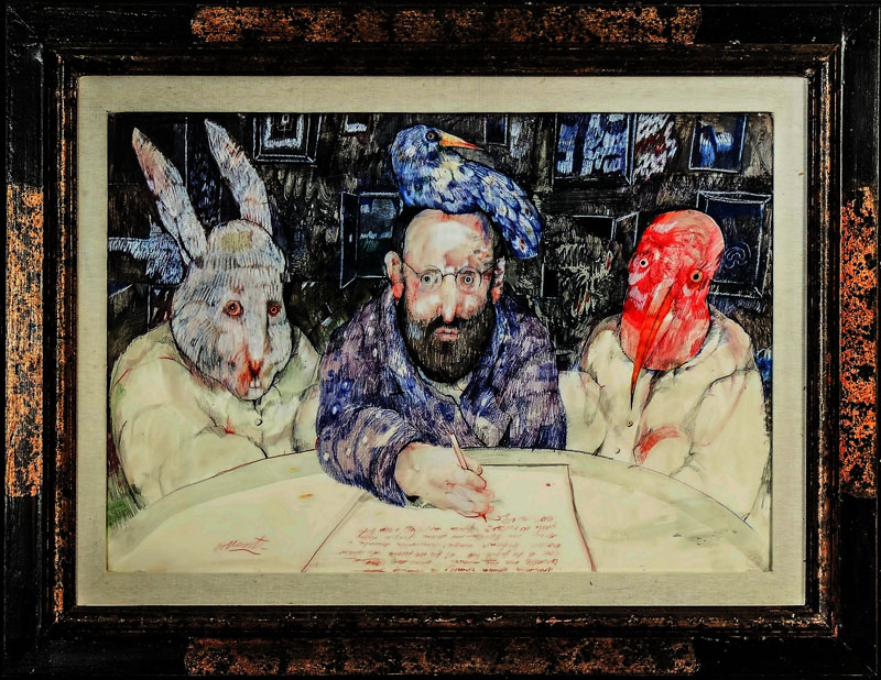 ANTONIO POSSENTI Veduta d'interno con autoritratto e animali tecnica mista su cartone, firmato, in cornice cm 50x70 Al verso reca timbri Galleria d'Arte Faustini, Forte dei Marmi INTERIOR VIEW WITH SELF PORTRAIT AND ANIMALS, MIXED MEDIA ON CARDBOARD, WITH STAMP ON REVERSE
