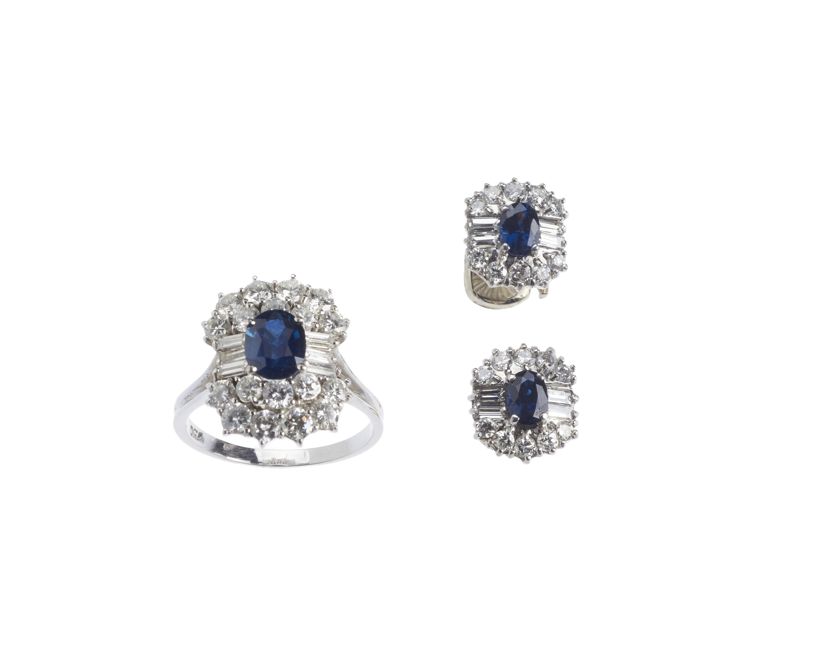 Parure composta da anello e orecchini in oro bianco 18k con zaffiri . . . Anello: