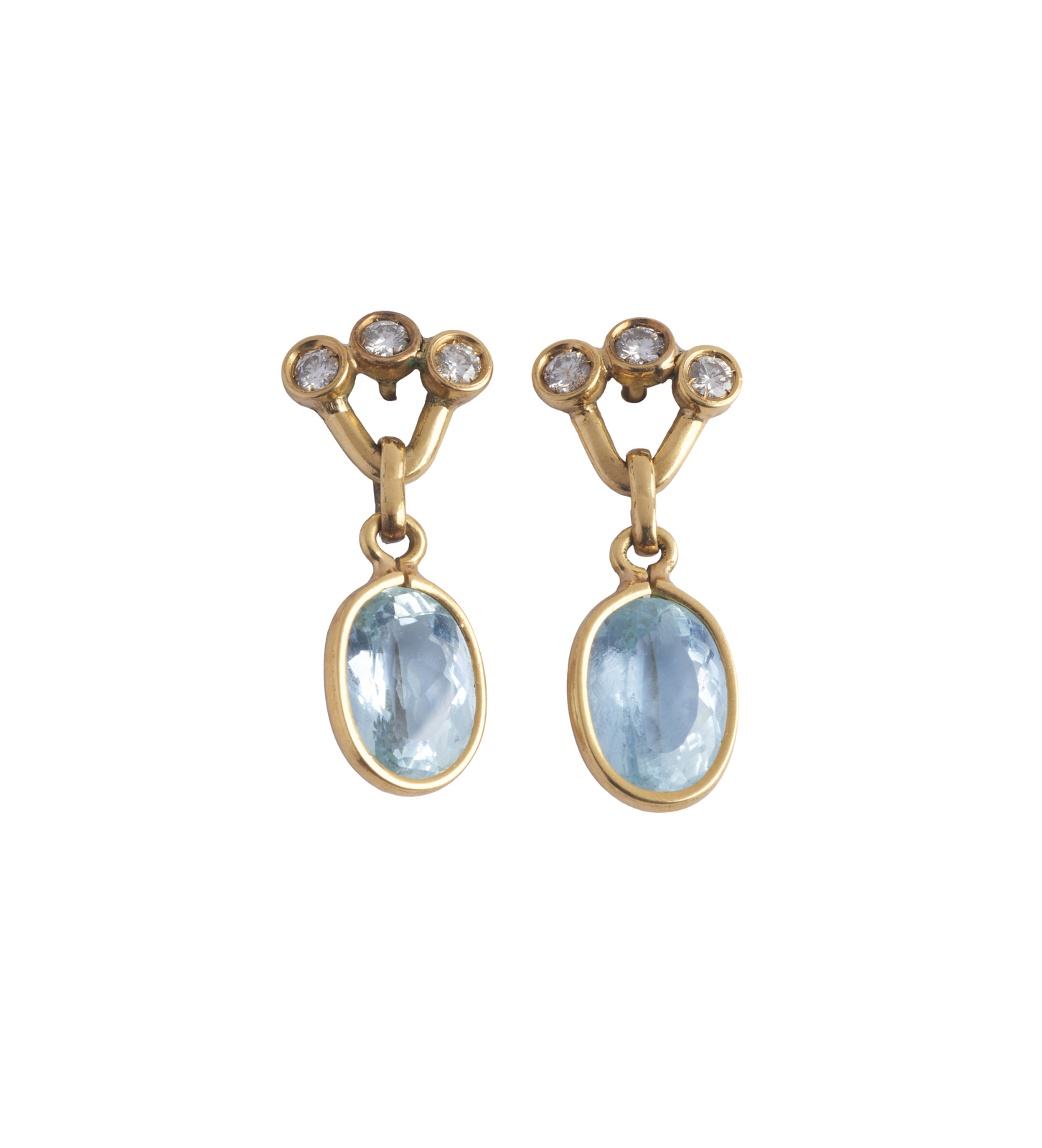 - Paio di orecchini in oro giallo 18k con diamanti bianchi e 2 acquemarine ovali .