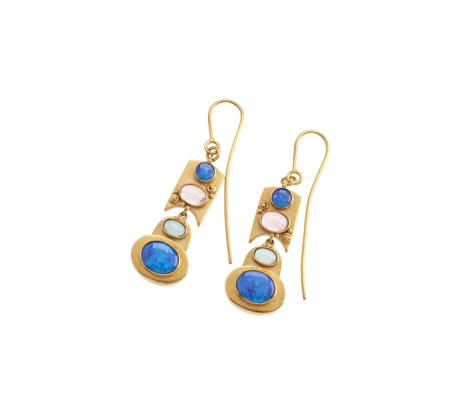 - Orecchini pendenti artigianali in oro giallo 18k con tormaline rosa e azzurre cabochon e opali .