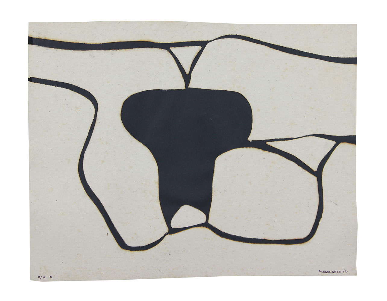 Marca-Relli Conrad Senza titolo, 1971 collage di tela applicato e tracce di bruciature su cartoncino, cm. 53x66, es. H/S D firmato e datato in basso a destra, opera esposta alla mostra "Marca-Relli. Archetipi - Ricomposti" presso la galleria Valente Artecontemporanea di Finale Ligure, 20 ottobre - 30 novembre 2002