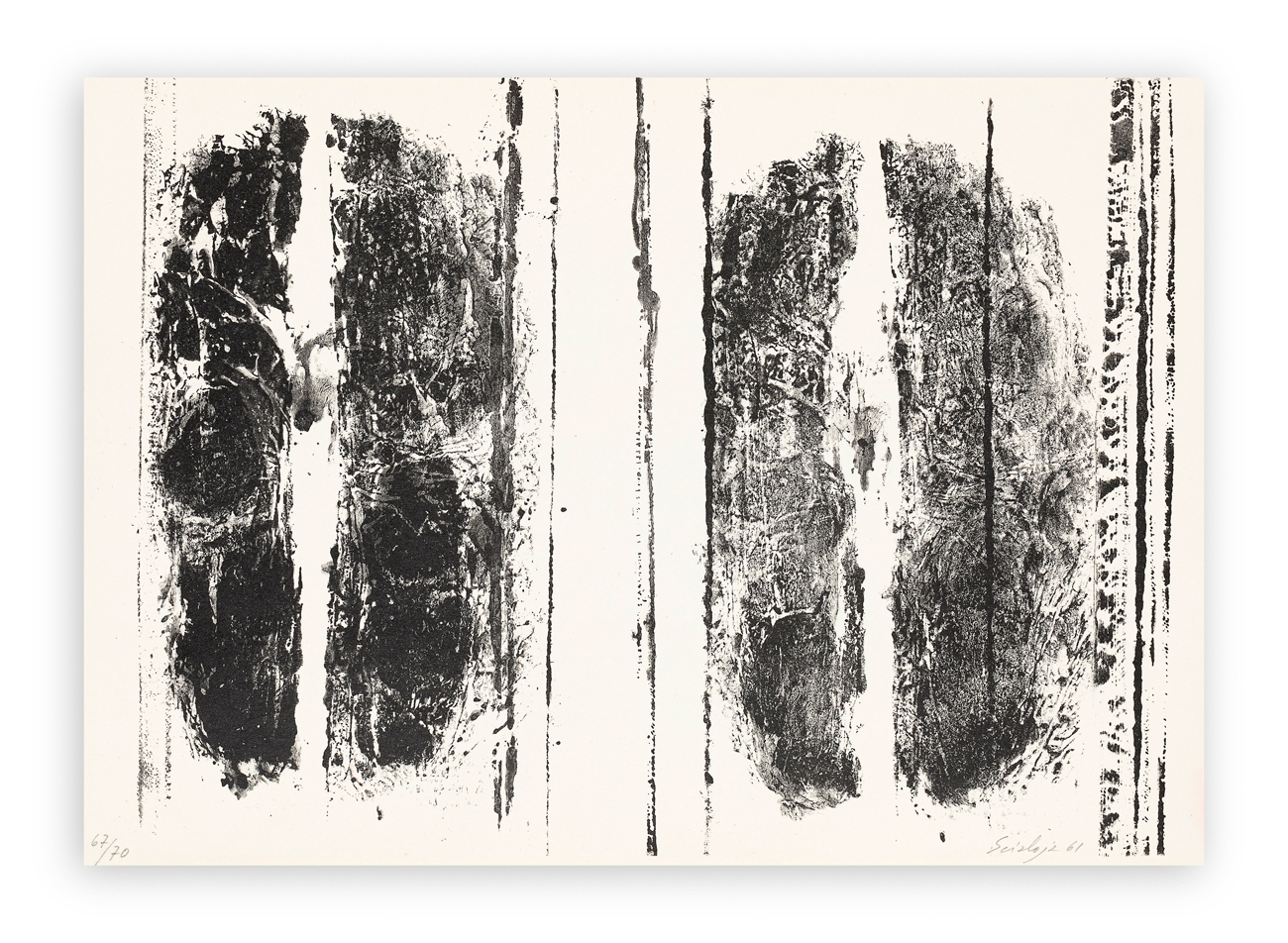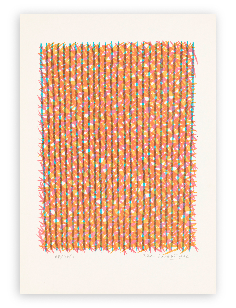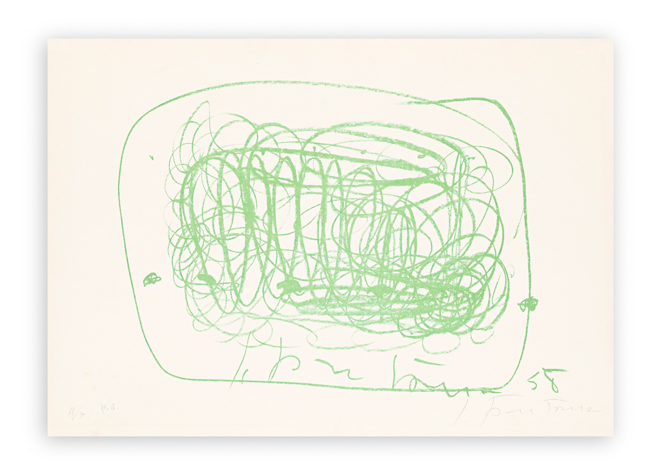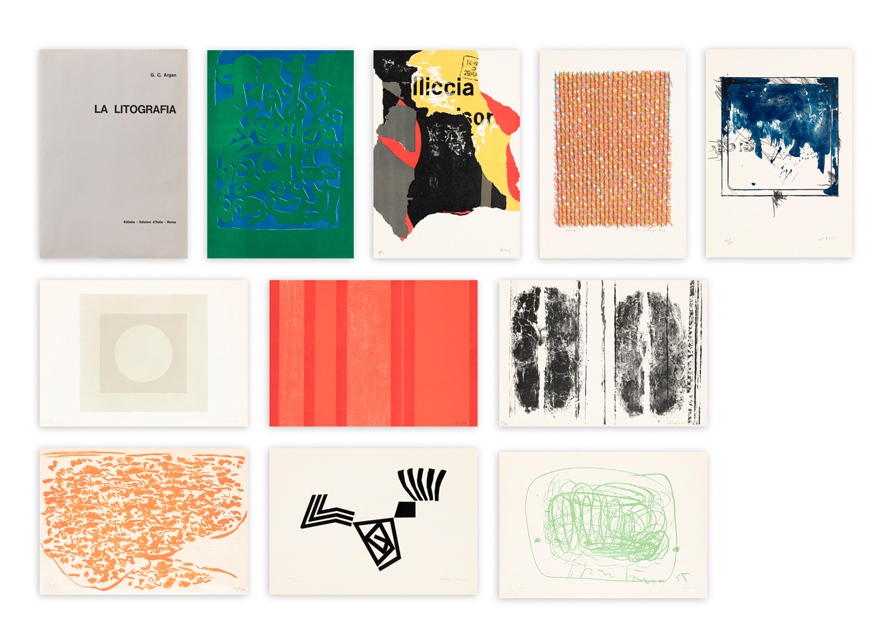 Cartella contenente 10 litografie di: Lucio Fontana, Piero Dorazio, Carla Accardi, Tano Festa, Mario Schifano, Francesco Lo Savio, Antonio Sanfilippo, Toti Antonio Scialoja, Mimmo Rotella ed Ettore Colla, con un testo introduttivo di Giulio Carlo Argan, ciascuna recante firma del rispettivo autore e numerazione (Esemplare 67/70) a matita al fronte