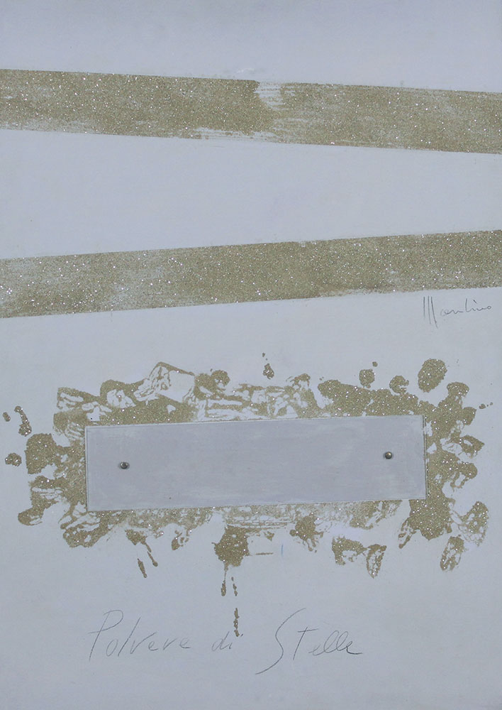 Mondino Aldo Polvere di Stelle, (anni '80) acrilico plexiglas e brillantini su masonite, cm. 80x60 firmato al centro a destra, intitolato in basso, opera archiviata presso l'Archivio Aldo Mondino