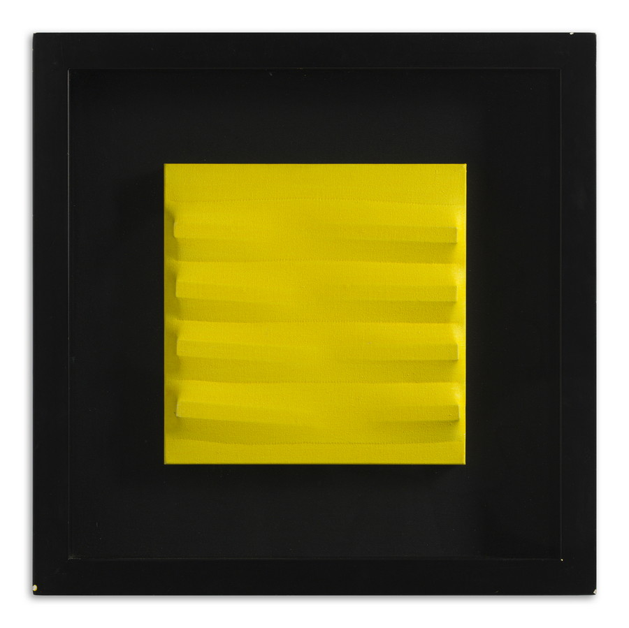 BONALUMI AGOSTINO (1935 - 2013) GIALLO. 1982. tempera vinilica su tela estroflessa. Cm 30,00 x 30,00. sul retro: firma ed etichetta Galleria d'Arte L'Incontro, Chiari (BS)