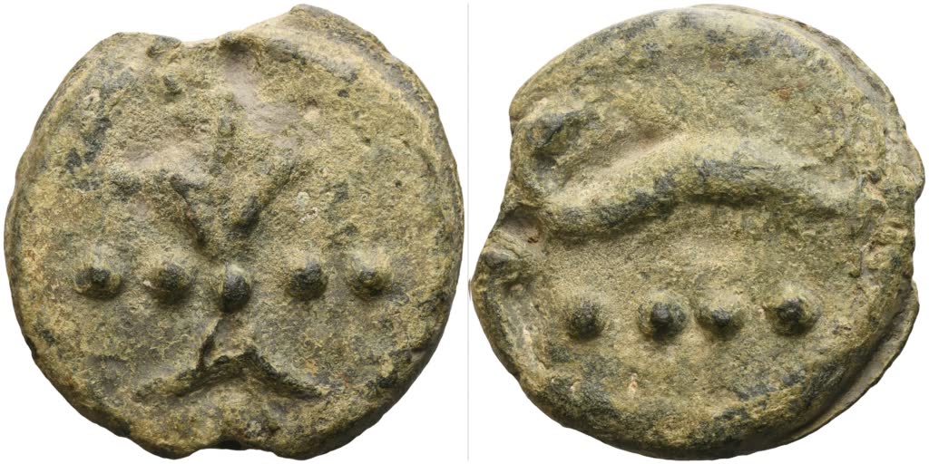 Thunderbolt, four pellets (mark of value) across fields; Rv. Dolphin swimming r., four pellets (mark of value) below. ICC 27; Crawford 14/3; HN Italy 270. Untouched green patina. Extremely fine.