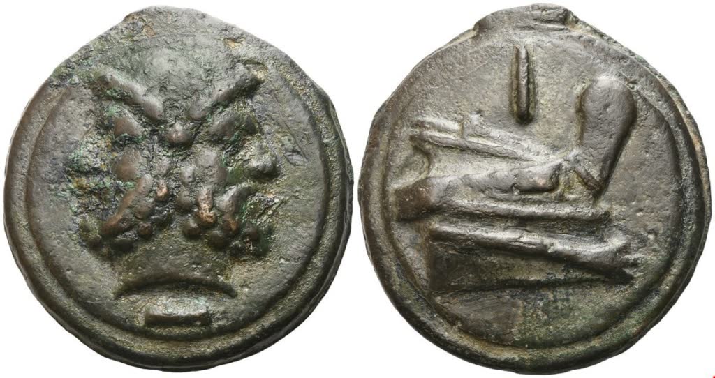 Janus/Prow to right series. Laureate and bearded head of Janus; below, I (mark of value) set horizontally; Rv. Prow r.; above, I (mark of value) set vertically. Crawford 35/1; Sydenham 71; ICC 74; HN Italy 337. Dark brownish green patina. About extremely fine / extremely fine. High relief.