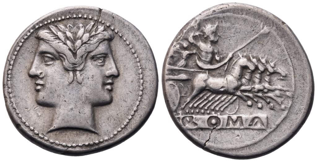 Laureate head of Janus; Rv. upiter in quadriga driven by Victory r., holding thunderbolt and sceptre; below, ROMA incuse on raised tablet. Crawford 28/3 pl. II.4, 6; Debernardi Q2. Small crack at 1 o'clock on the obverse, otherwise good very fine.