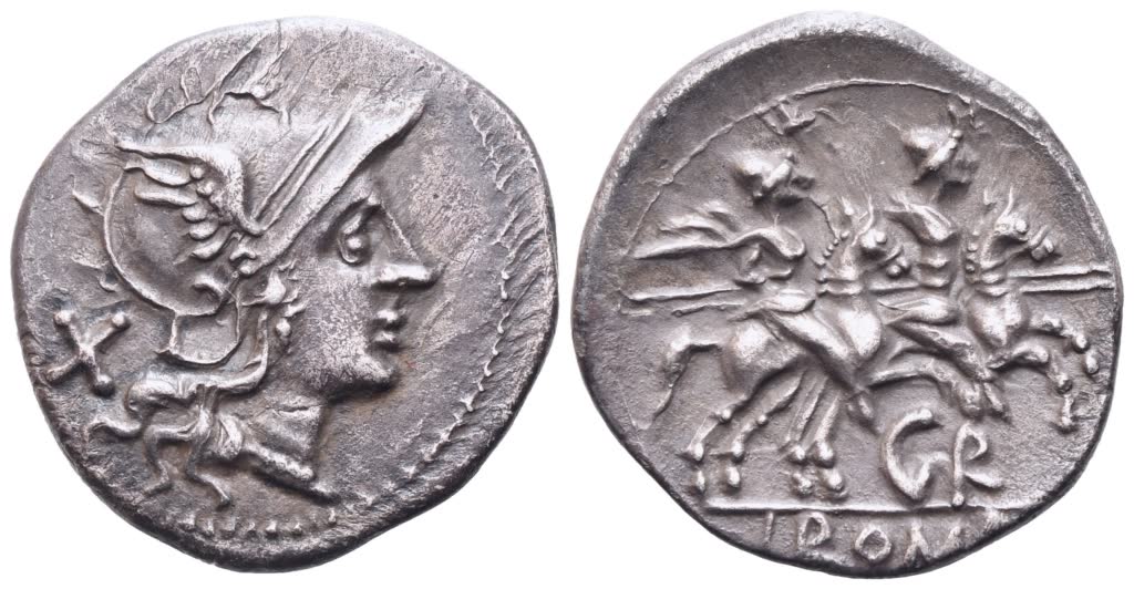 Uncertain mint. Helmeted head of Roma right; X (mark of value) to l.; Rv. Dioscuri, each holding spear, on horseback riding r.; GR below; in exergue, ROMA. Crawford 169/1; Babelon (Sempronia) 1; Sydenham 289. Slight porosity on the obverse, otherwise near extremely fine.