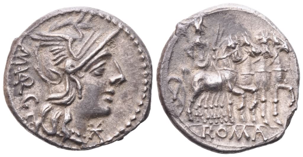 Helmeted head of Roma right; behind, M·VARG; below chin, * (mark of value); Rv. Jupiter in slow quadriga r., holding thunderbolt in l. and branch in r. hand; ROMA in exergue. Crawford 257/1; Babelon (Vargunteia) 1; Sydenham 507. Extremely fine.