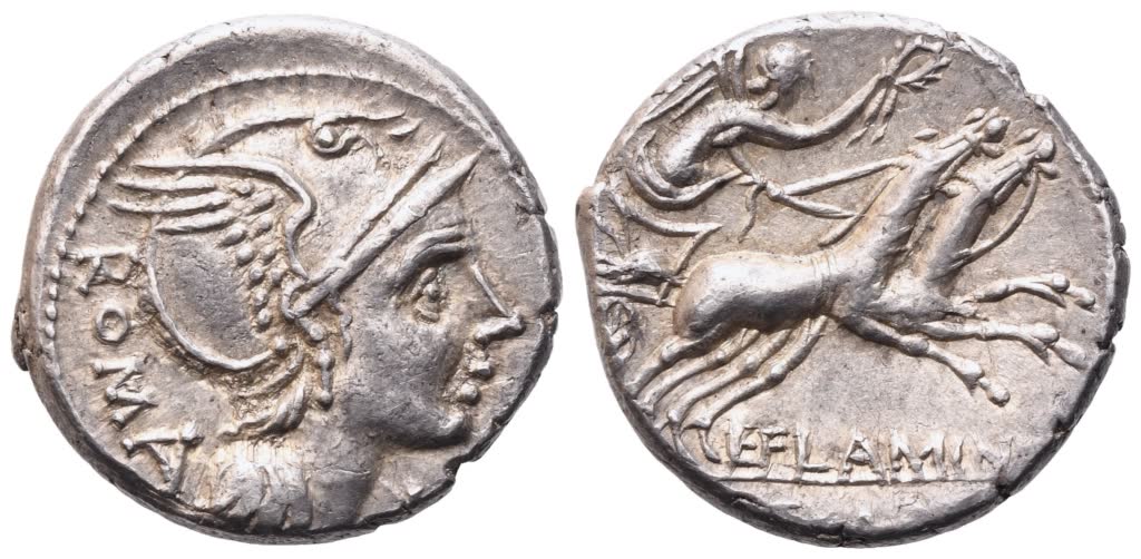 Head of Roma to r., wearing winged helmet; before, [X (mark of value)]; behind, ROMA downwards; Rv. Victory driving biga to r., holding wreath in her r. hand and reins in her l.; below, L·FLAMINI; in exergue, [CILO]. Crawford 302/1; Babelon (Flaminia) 1; Sydenham 540. About extremely fine.