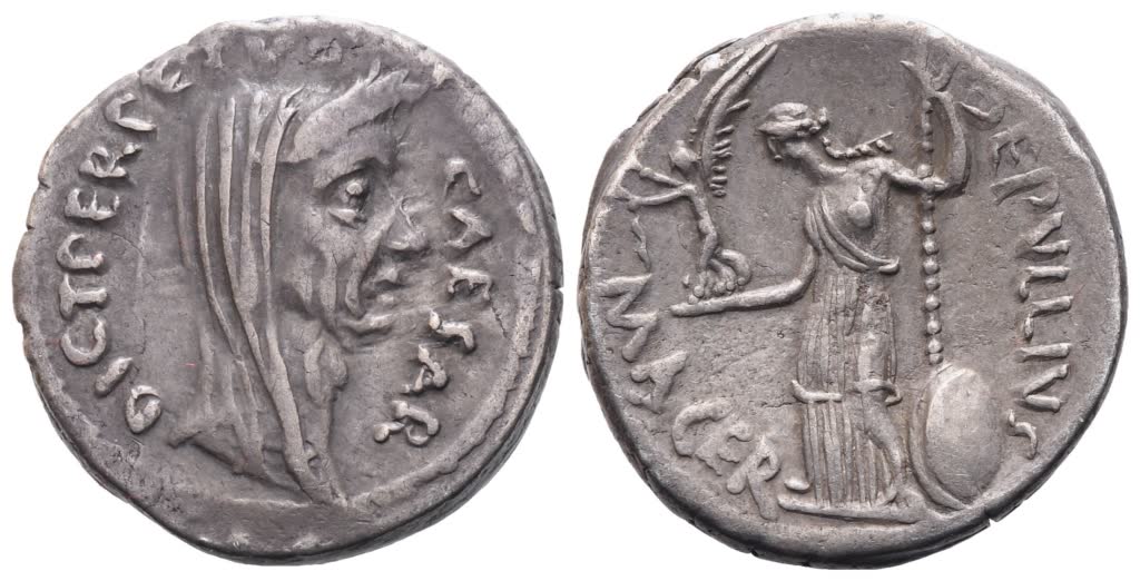 Veiled and wreathed head of Caesar r.; around, CAESAR – DICT PERPETVO ; Rv. Venus standing l., holding Victory and sceptre resting on shield; on r., [P·]SEPVLLIVS downwards; on l., MACER downwards. Crawford 480/13; Babelon (Julia) 50, (Sepullia) 5; Sydenham 1074; Sear Imperators 107d. About extremely fine.