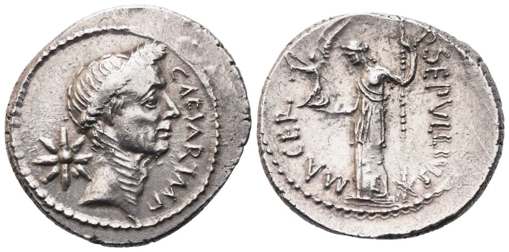 Wreathed head of Caesar r.; behind, eight-rayed star; before, CAESAR·IMP downwards; Rv. Venus standing l., holding Victory and sceptre resting on star; to r., P·SEPVLLIVS downwards; to l., MACER upwards. Crawford 480/5a; Babelon (Julia) 46, (Sepullia) 1;Sydenham 1071; Sear Imperators 106. Extremely fine.