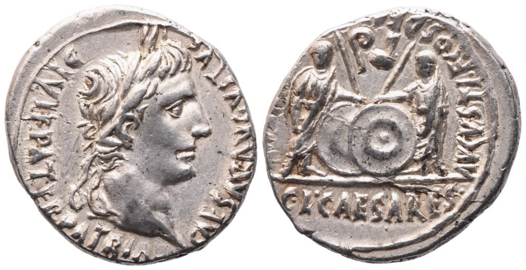 CAESAR AVGVSTVS DIVI F PATER PATRIA[E] Laureate head r.; Rv. AVGVSTI·F·COS·DESI[G·PRINC·IVVENT Gaius and Lucius standing facing, two shields and two sceptres between them; simpulum and lituus above; C·L·CAESARES in exergue. RIC 207; Cohen 43. Extremely fine.