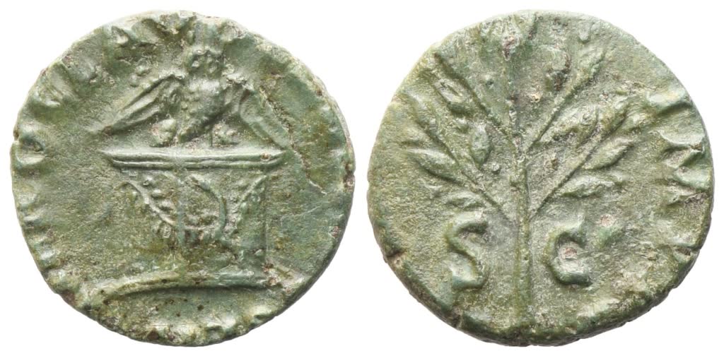 NERO CLAV CAE AVG GER Owl, with spread wings, standing facing on garlanded altar; Rv. P M TR P IMP PP / S C Upright olive branch. RIC 260; Cohen 185. Appealing light green patina. Untouched. Extremely fine.