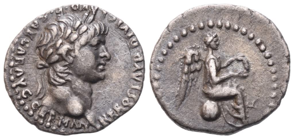 NERO CLAVD DIVI CLAVD F CAESAR AVG GERMANI Laureate head of Nero r.; Rv. Victory diademed and draped, seated r. on globe, holding wreath with both hands. RIC 617; BMC 409; RPC 3645. About extremely fine.