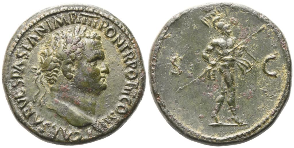 T CAESAR VESPASIAN IMP IIII PON TR POT II COS II Laureate head r., Rv. Mars advancing r., holding trophy and spear; in field, S - C. RIC II 500. Bold portrait; green patina; small cuprite spots; minor traces of light, old cleaning; good very fine.