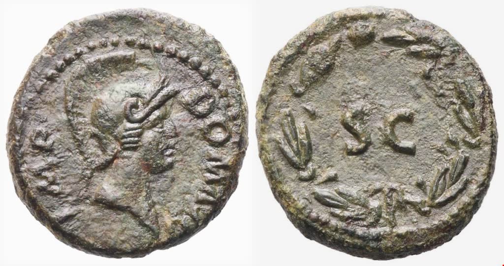 IMP DOM AVG Head of Minerva to r., wearing crested Attic helmet; Rv. Large S C within laurel wreath. RIC 123; Cohen –. BMC 485; CBN 521-2. Dark green patina. Extremely fine.