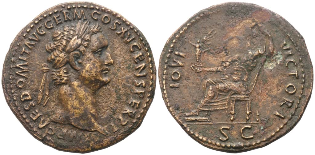 IMP CAES DOMIT AVG GERM COS XV CENS PER P P Laureate head of Domitian to r.; Rv. IOVI VICTORI / S C Jupiter seated leftl. holding Victory in his r. hand and sceptre in his l. RIC 702; Cohen 314. Some areas of flatness on the reverse, otherwise extremely fine / about extremely fine.