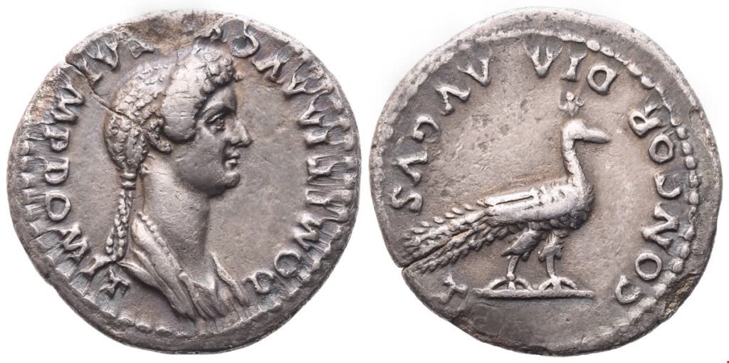 DOMITIA AVGVSTA IMP DOMIT Draped bust r., hair in long tail at back; Rv. CONCORDIA AVGVST, peacock r. RIC I 212 = II 151; Cohen 2. Crack at 11 o'clock on the obverse; possibly subaeratus, otherwise about extremely fine.