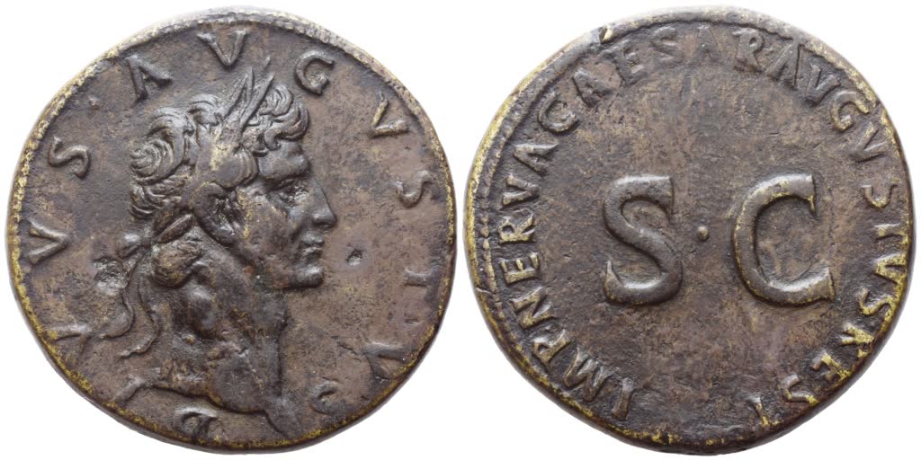 DIVVS AVGVSTVS , laureate head of Divus Augustus r.; Rv. IMP NERVA CAESAR AVGVSTVS REST around large SC. RIC 136 (Nerva); Cohen 570. Rare issue. A bold portrait of superb style; deep brown tone. Some light traces of smoothing, otherwise about extremely fine / good very fine. Brown tone.