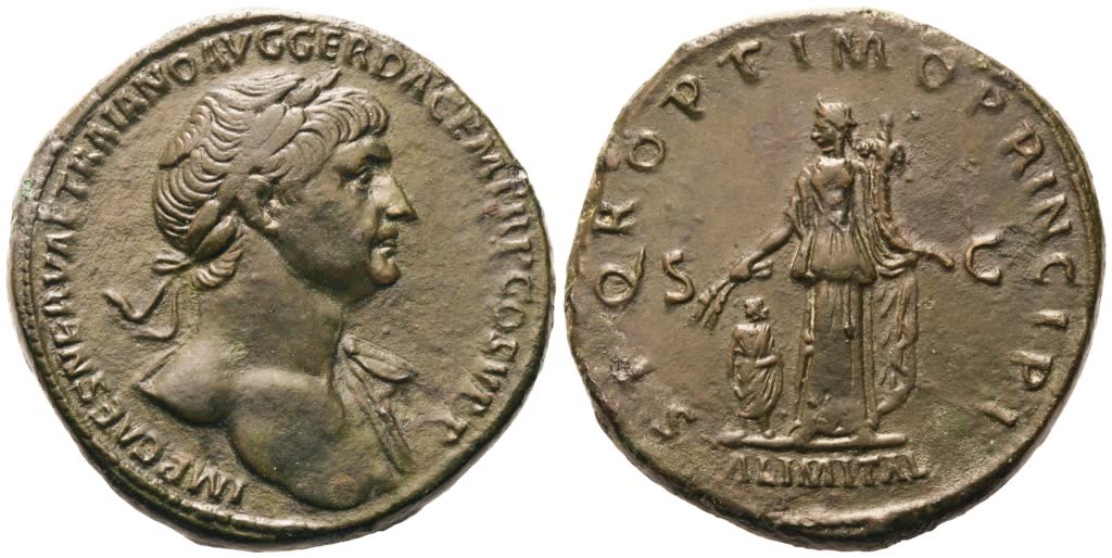 Trajan Æ Sestertius. Rome, AD 111. IMP CAES NERVAE TRAIANO AVG GER DAC P M TR P COS V P P Laureate bust to r., slight drapery on far shoulder; Rv. S P Q R OPTIMO PRINCIPI Abundantia standing to l., holding grain ears and cornucopia, child holding roll at feet; S-C across fields, ALIM ITAL in exergue. RIC 459; Cohen 7. Dark brown patina. Gently cleaned. Near extremely fine / extremely fine.