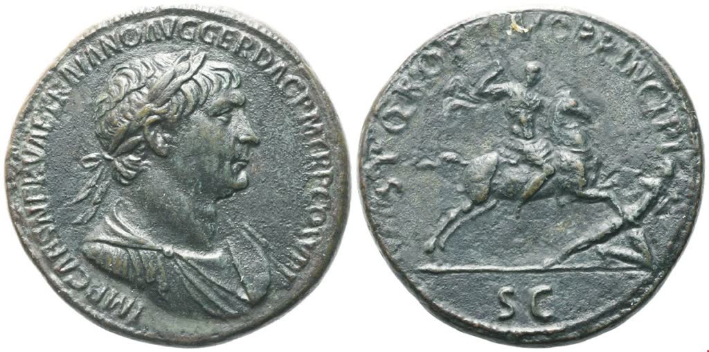 IMP CAES NERVAE TRAIANO AVG GER DAC P M TR P COS V P P Laureate, draped and cuirassed bust r., Rv. S P Q R OPTIMO PRINCIPI Trajan, in armour, on horse leaping r., hurling spear at Dacian falling r., looking back in supplication; in ex. S C. RIC 536; Cohen 504.Dark green tone; expressive portrait; good extremely fine.