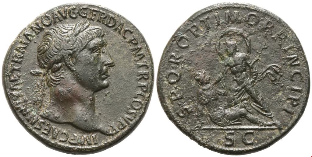 IMP CAES NERVAE TRAIANO AVG GER DAC PM TR P COS V P P Laureate head r., Rv. S P Q R OPTIMO PRINCIPI Danuvius (the Danube) standing l., placing knee on Dacia, whom he forces to the ground; in ex. S C. RIC 556. Untouched dark green patina; about extremely fine.