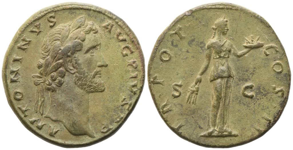 ANTONINVS AVG PIVS P P Laureate head of Antoninus Pius to r.; Rv. TR POT COS II / S - C Fides standing facing, her head turned to r., holding two ears of grain in her r. hand and a plate of fruit in her l. RIC 546; Cohen 846. A fascinating example, with a lovely green patina; untouched. Extremely fine.