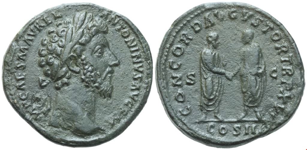IMP CAES M AVREL ANTONINVS AVG P M Laureate head of Marcus Aurelius to r.; Rev. CONCORD AVGVSTOR TR P XVI / S – C Marcus Aurelius, togate on the l., and Lucius Verus, togate on the r. and holding scroll in his l. hand, standing facing each other and clasping their r. hands; in his l. hand, Marcus Aurelius holds a scroll. RIC 826; Cohen 54. Appealing grey-green patina; untouched. Extremely fine.