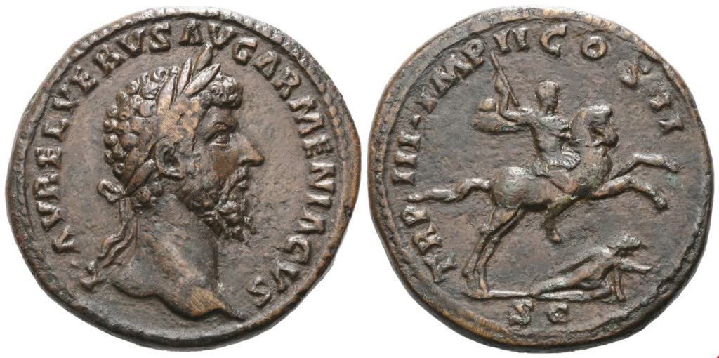 L AVREL VERVS AVG ARMENIAVS Laurate bust r.; Rv. TR P III IMP II COS II Verus on horse riding r., thrusting at a fallen enemy. RIC 1363; Cohen –. Glossy dark brown patina. Traces of old, delicate cleaning. About extremely fine / good very fine. Expressive portrait.