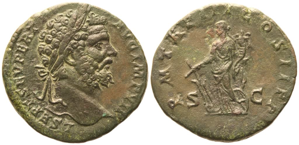 L SEPT SEV PERT AVG IMP VII Laureate head r.; Rv. PM TR P III COS II PP Fortuna standing l. holding rudder on globe and cornucopia; wheel at her feet; S – C across fields. RIC 706; Cohen 405. Olive green patina with reddish hues. Some gentle cleaning. Near extremely fine.