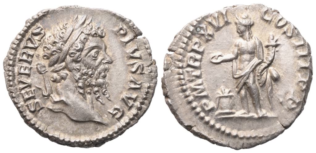 SEVERVS PIVS AVG Laureate head r.; Rv. P M TR P XVI COS III P P, Genius standing l., holding cornucopia and sacrificing out of patera over altar. RIC 220; Cohen 505. Extremely fine.