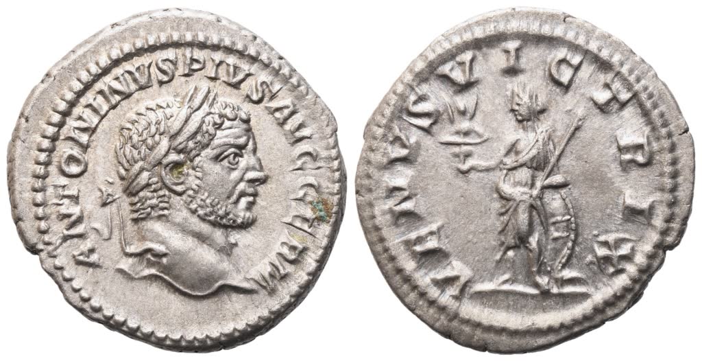 ANTONINVS PIVS AVG GERM Laureate and draped bust of Caracalla to r.; Rv. VENVS VICTRIX Venus standing to l., holding helmet and sceptre, resting on shield. RIC 311b; Cohen 606. Good extremely fine.