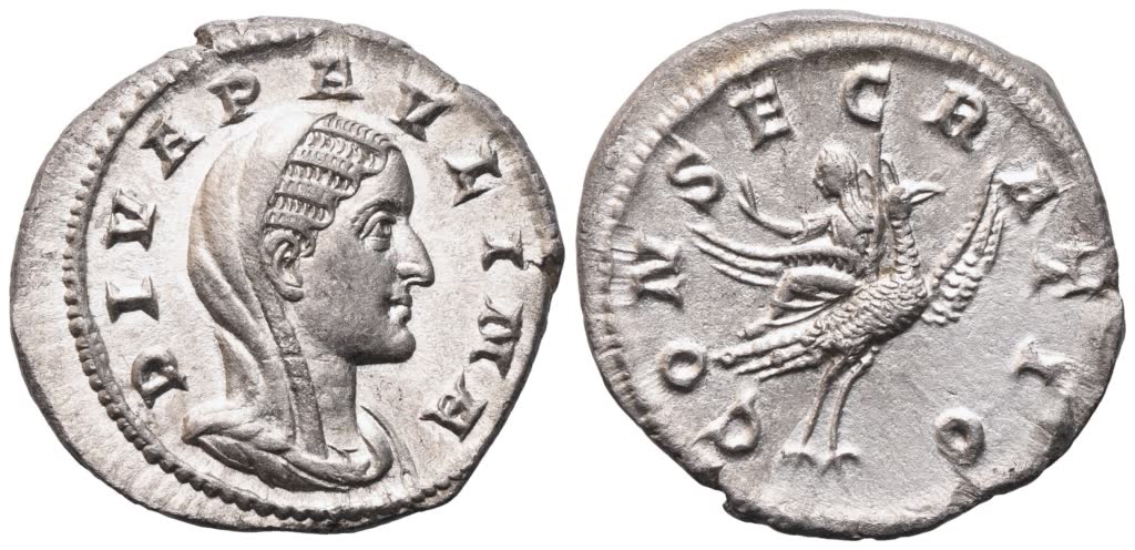 DIVA PAVLINA Veiled and draped bust of Diva Paulina to r.; Rv. CONSECRATIO Diva Paulina, raising her r. hand and holding long sceptre in her l., reclining l. on peacock flying to r. RIC 2; Cohen 2. Lustrous; elegant portrait. Good extremely fine.