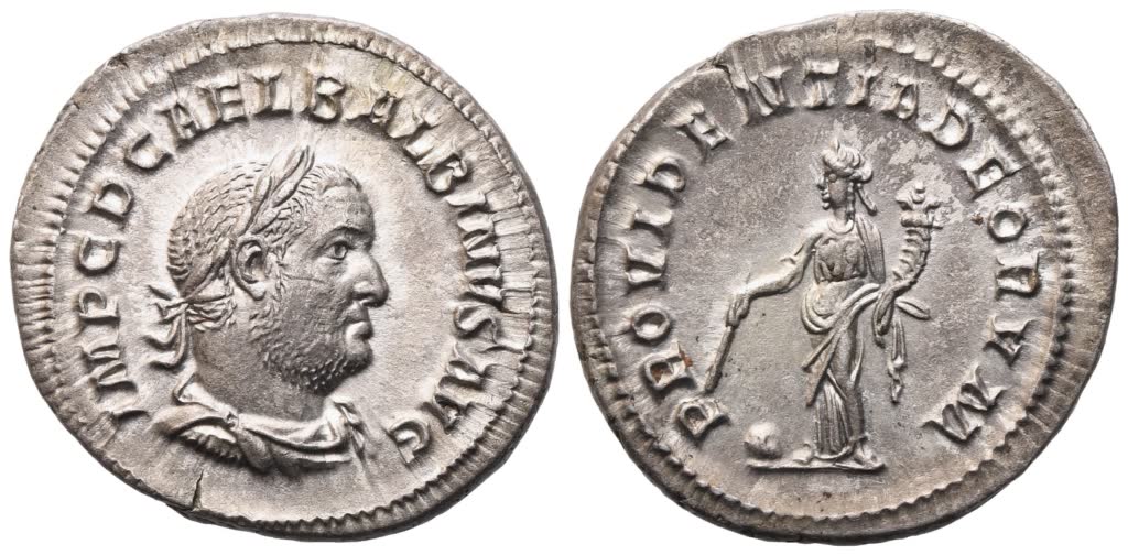IMP C D CAEL BALBINVS AVG Laureate, draped and cuirassed bust of Balbinus to r.; Rv. PROVIDENTIA DEORVM Providentia standing front, head to l., holding wand over globe in her r. hand and cornucopia in her l. RIC 7; Cohen 23. Near FDC.