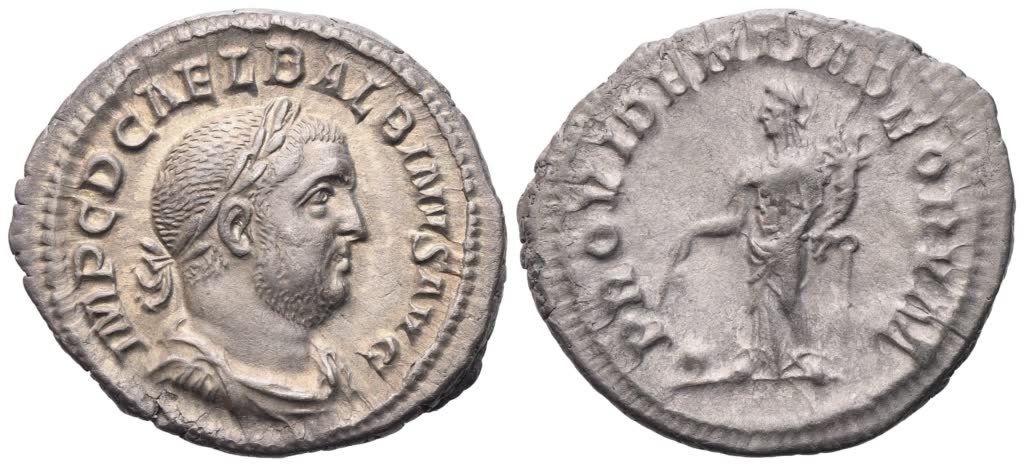 IMP C D CAEL BALBINVS AVG Laureate, draped and cuirassed bust of Balbinus r.; Rv. PROVIDENTIA DEORVM Providentia draped, standing facing, head turned to l., holding wand in the r. hand over globe at her feet to l. and cornucopia on her l. arm. RIC 7; Cohen 23. Extremely fine / about extremely fine.