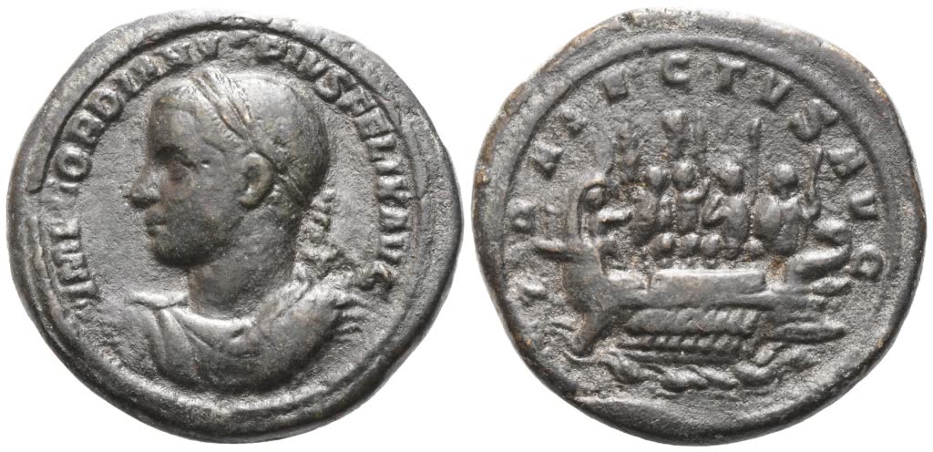 IMP GORDIANVS PIVS FELIX AVG Laureate, draped and cuirassed bust of Gordian III to l.; Rv. TRAIECTVS AVG Galley Galley r. with pilot, five oarsmen and four soldiers, two carrying insignia, the others armed with lances and shields; behind, a banner. Gnecchi 61 (pl. 153 n. 13); Cohen 344. R4. Dark brown patina. Traces of old cleaning. About extremely fine.