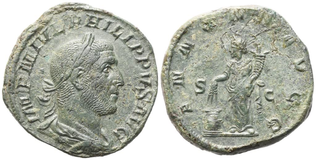 IMP M IVL PHILIPPVS AVG Laureate, draped and cuirassed bust of Philip I to r.; Rv. ANNONA AVG / S - C Annona standing l., holding grains ears in r. hand and cornucopia in l.; to l., modius filled with grain ears. RIC 168a; Cohen 26. Light green patina; gently cleaned. Extremely fine.