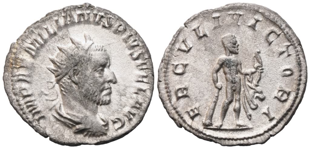 IMP AEMILIANVS PIVS FEL AVG Radiate, draped and cuirassed bust of Aemilian to r.; Rv. ERCVL VICTORI Hercules standing front, head to r., leaning his r. hand on club set on ground and holding arrow in his l.; lion skin draped over his l. arm. RIC 3b var.; Cohen 13 var. About extremely fine.