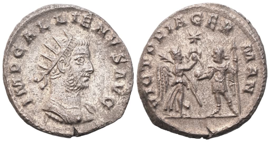 IMP GALLIENVS AVG Radiate and cuirassed bust of Gallienus to r.; Rv. VICTORIA GERMAN Gallienus standing to l., holding sceptre, receiving wreath from Victory standing to r.; above, star. RIC 452; Cohen 1173. Extremely fine.