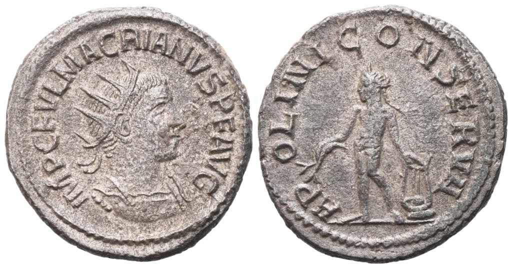 IMP C FVL MACRIANVS P F AVG Radiate and cuirassed bust of Macrianus to r.; Rv. APOLINI CONSERVA Apollo standing front, head to l., holding branch in his r. hand and resting his l. upon lyre; in field to l., eight-pointed star. RIC 6; Cohen 2. Slight porosity. Extremely fine.
