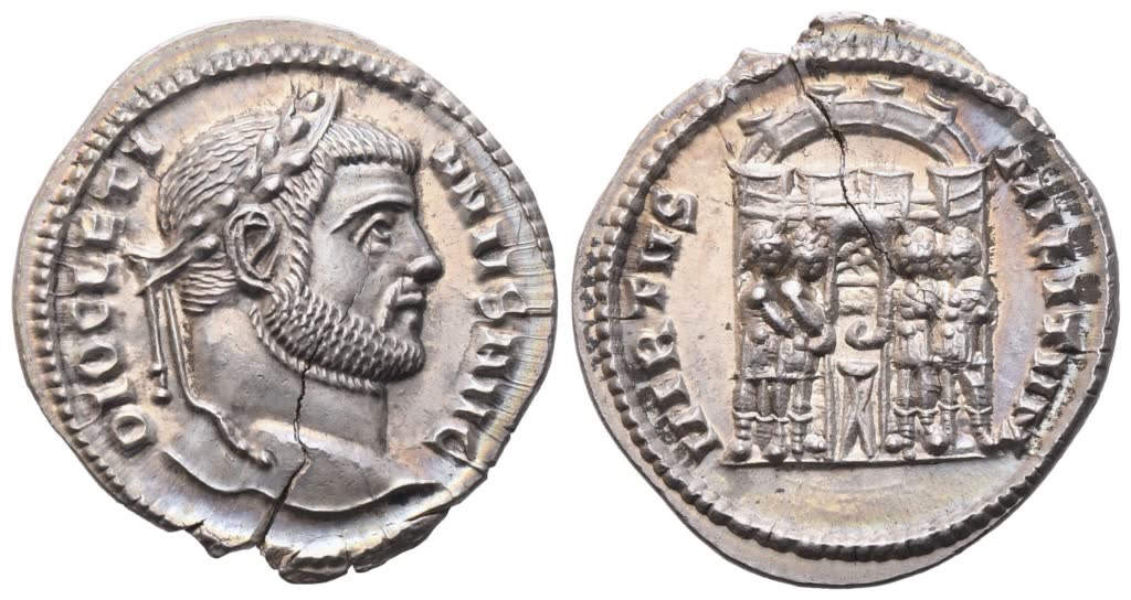 DIOCLETIANVS AVG Laureate head of Diocletian r.; Rv. VIRTVS MILITVM The four Tetrarchs sacrificing over tripod, before turreted enclosure. RIC 32a; Cohen 516. Crack at 6 o'clock on the obverse, otherwise good extremely fine / extremely fine.
