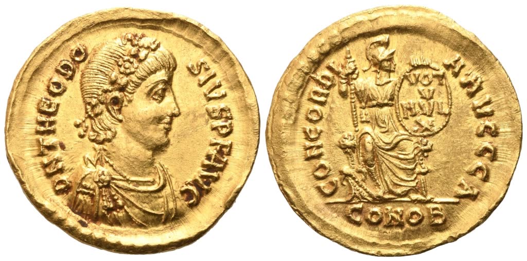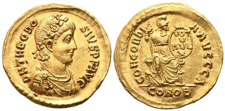 D N THEODO - SIVS P F AVG Diademed, draped and cuirassed bust r.; Rv. CONCORDI - A AVGGG A Constantinopolis seated facing, head r. and foot on prow, holding sceptre and shield inscribed VOT / V / MVL / X; in exergue, CONOB. RIC 70b. Good extremely fine.